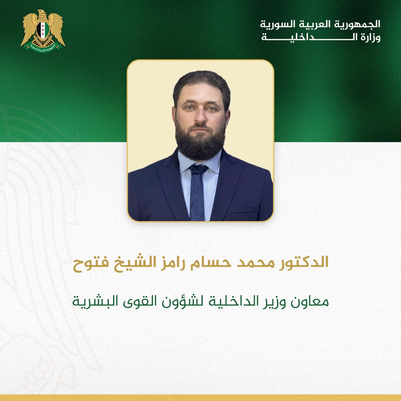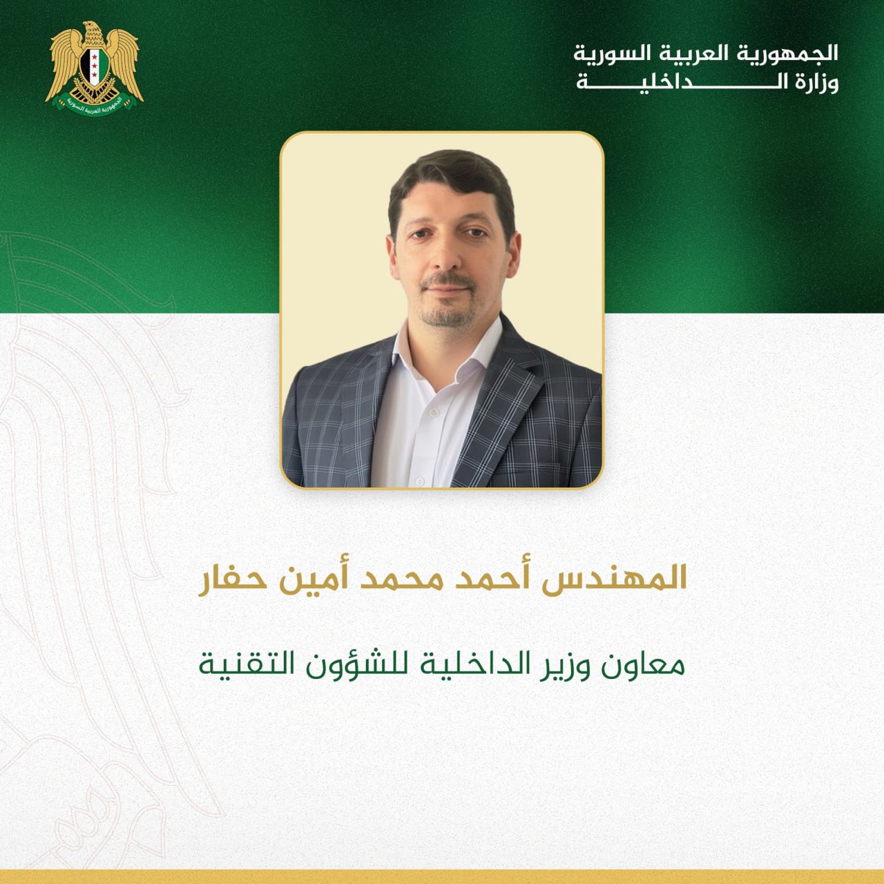 L’ingénieur Ahmad Mohamad Amin Haffar a été nommé ministre adjoint de l’Intérieur pour les affaires techniques, et Dr Mohamad Hossam Ramez Al-Cheikh Fattouh ministre adjoint pour les affaires des ressources humaines.