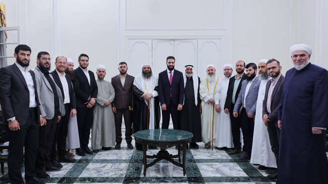 Alep-SANA/ Lors de sa visite à Alep, le président de la République arabe syrienne, Ahmad Al-Charaa, a rencontré une délégation de savants et de cheikhs.
