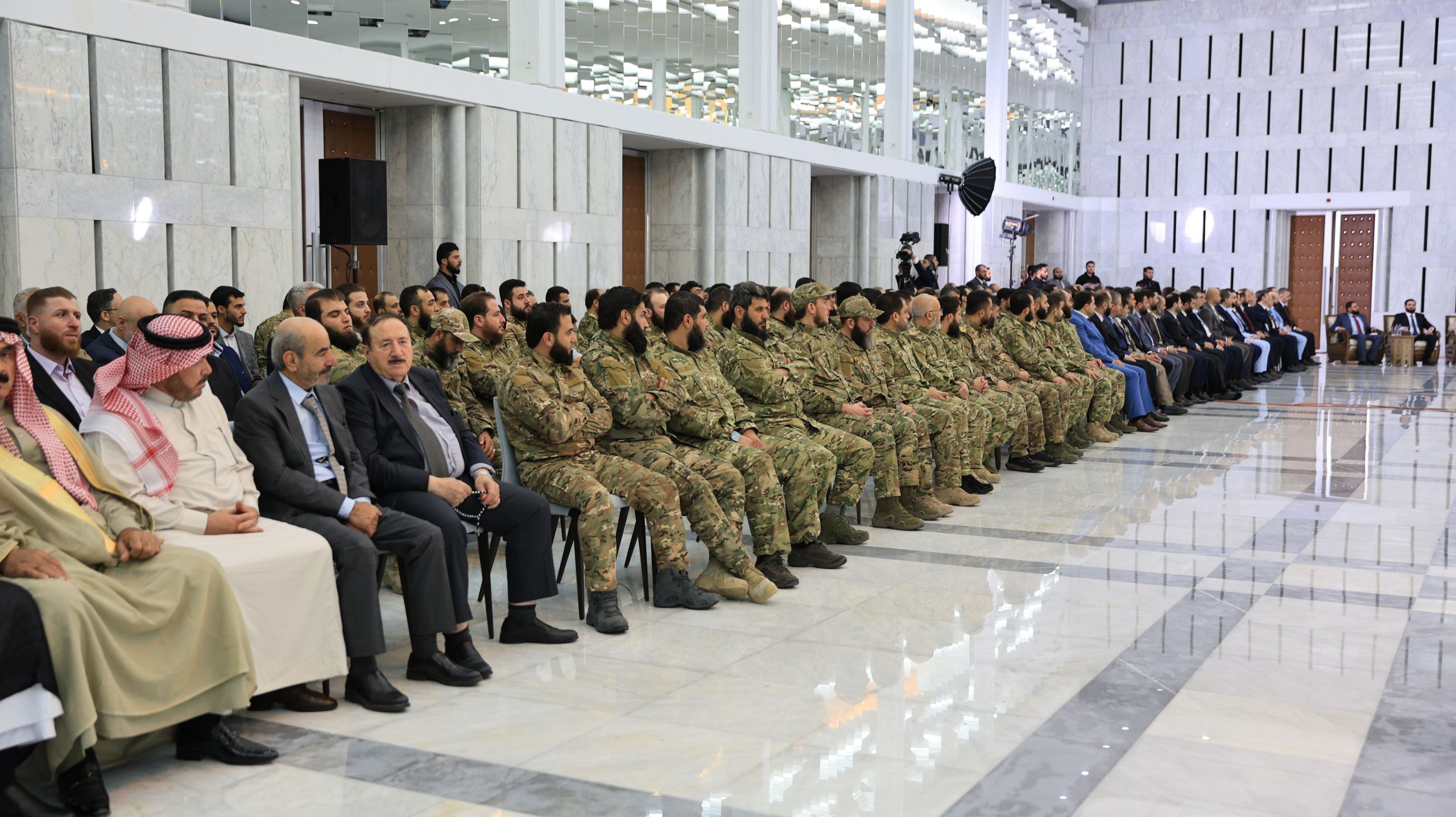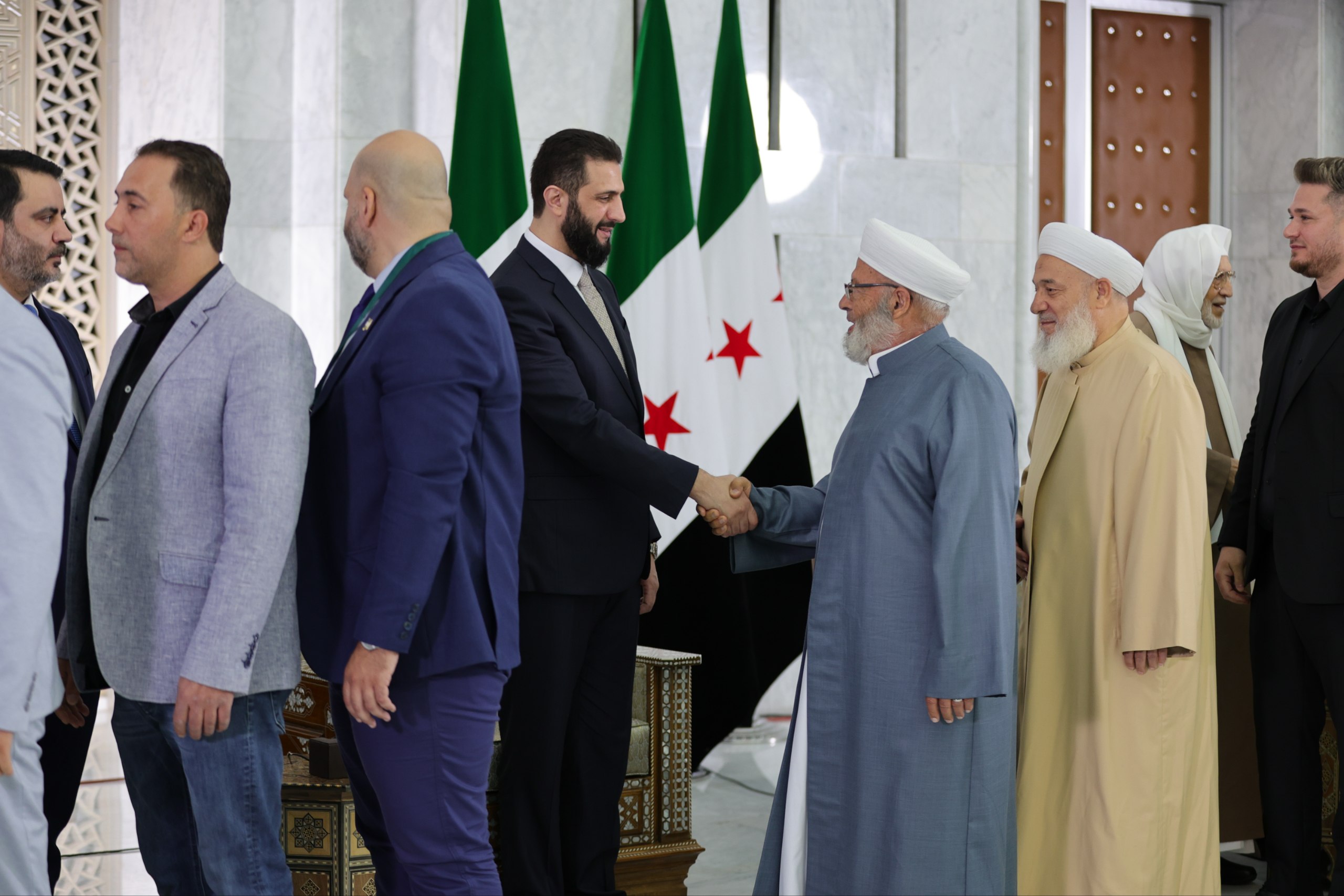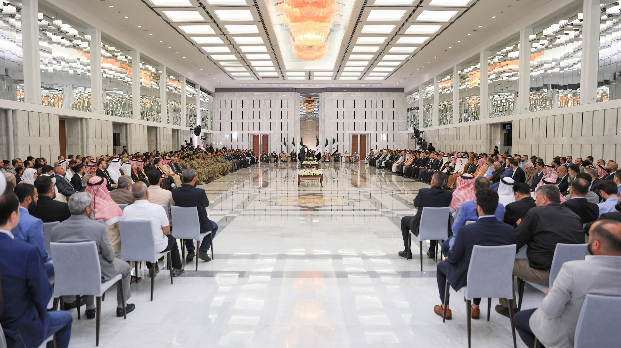 Damas-SANA / Le président Ahmad al-Charaa échange ses vœux pour l’Aïd al-Adha avec un certain nombre d’habitants et de responsables au Palais du peuple à Damas.