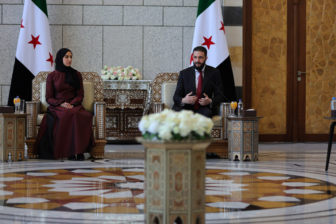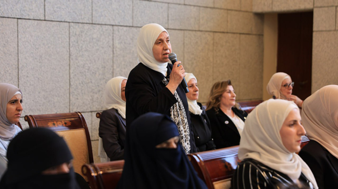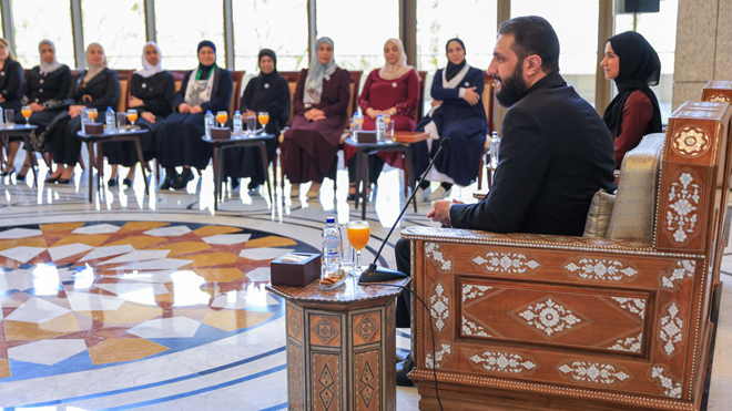 Le président Al-Charaa a insisté sur le fait que la femme syrienne n’a jamais été marginalisée, mais qu’elle a été présente avec force durant la révolution, et qu’elle est aujourd’hui active dans la bataille de la reconstruction et dans la construction de l’avenir de la Syrie.