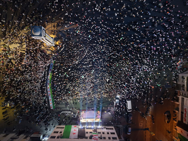 Des milliers de personnalités et d’admirateurs d’al-Sarout se sont rassemblés sur la place de l’Horloge Nouvelle, brandissant le drapeau de la révolution syrienne et des portraits du martyr qui eut joué un rôle important dans le mouvement populaire contre le régime déchu. Des chants révolutionnaires et des slogans ont été interprétés appelant à la liberté et rendant hommage aux martyrs.