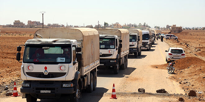 Daraa – SANA / Un convoi d’aides humanitaires octroyées par l’Organisation du Croissant-Rouge arabe syrien est arrivée aujourd’hui au gouvernorat de Soueïda via le passage Bosra al-Cham, dans le cadre des efforts continus visant à renforcer la réponse humanitaire aux familles touchées et à répondre à leurs besoins essentiels.