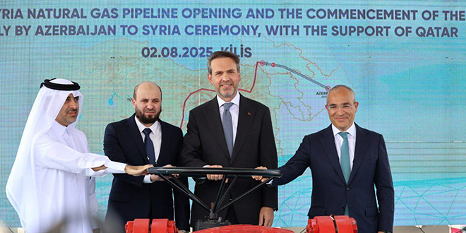 Damas-SANA/ Le gazoduc reliant la Syrie à la Turquie a été inauguré aujourd’hui, en présence du ministre syrien de l’Énergie, l’ingénieur Mohammad al-Bachir, du ministre turc de l’Énergie, Alparslan Bayraktar, du ministre azerbaïdjanais de l’Économie, Mikayil Jabbarov, ainsi que de représentants du Fonds qatari pour le développement.