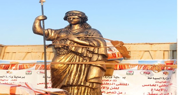 Damas / La statue de Zénobie est arrivée ce soir à la place des Omeyyades à Damas pour y rester quatre jours avec le monument commémoratif du martyr Khaled Assa’ad dans le cadre de l’activité intitulée “De Palmyre vers Damas” et de la 5ème rencontre de l’art et de la créativité organisée par le ministère du tourisme.