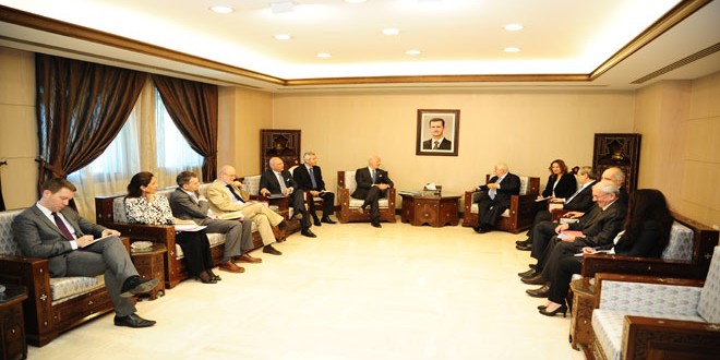 Damas / Le vice-président du Conseil des Ministres, ministre des Affaires étrangères et des Expatriés, Walid Mouallem, a reçu aujourd’hui l’émissaire spécial du Secrétaire général de l’ONU pour la Syrie, Staffan de Mistura, et la délégation qui l’accompagne.