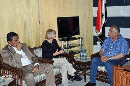 Homs / Le gouverneur de Homs, Talal Barazi, a examiné avec la directrice du Service de la lutte anti-mines aux Nations unies (UNMAS), Agnès Marcaillou, l’état de l’action humanitaire dans le gouvernorat de Homs et les moyens de consolider la coopération bilatérale dans le domaine du désamorçage des mines plantées par les réseaux terroristes armés dans certains quartiers dans la ville.