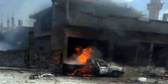 Homs / Douze personnes sont tombées en martyr alors que 40 autres ont été grièvement blessées dans un double attentat-suicide terroriste à la voiture et au motocycle piégés, dans la localité de Mukharram Foqani dans la banlieue est de Homs, selon le correspondant de Sana à Homs.