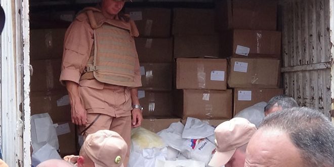 Daraa/ Avec la coopération du gouvernorat de Daraa, des aides humanitaires, octroyées par la Russie, ont été distribuées aujourd’hui à la population de la localité de Jebab et aux personnes déplacées qui y résident.