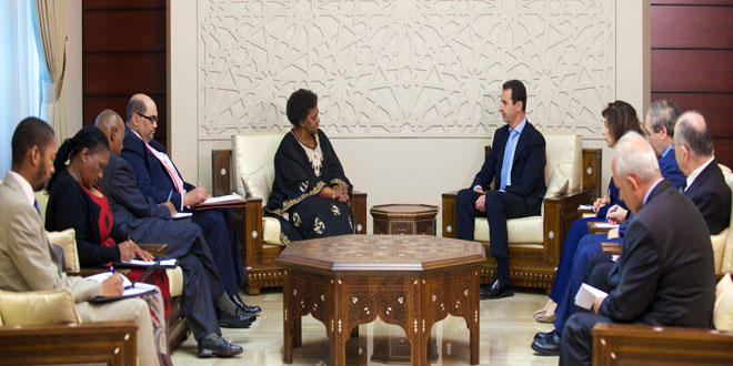 Damas / Le président Bachar al-Assad a examiné aujourd’hui avec Mme Nomaindiya Mfeketo, vice-ministre sud-africaine des relations et de la coopération internationales, les derniers développements de la situation en Syrie.