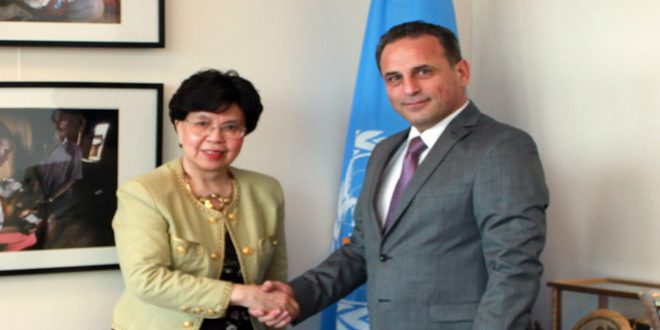 Genève/Le ministre de la Santé, Dr Nizar Yazaji, a discuté aujourd’hui à Genève avec la directrice générale de l’Organisation mondiale de la Santé (OMS), Margaret Chan, des perspectives de coopération entre les deux parties et des efforts du ministère pour faire parvenir les services sanitaires aux citoyens, surtout aux sinistrés.
