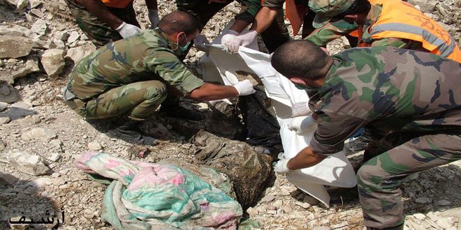 Une source sur le terrain a déclaré au correspondant de l’Agence Sana que lors des opérations de ratissage de l’aéroport de Palmyre, on a trouvé une fosse commune au sud-ouest de l’aéroport contenant 31 dépouilles, dont un enfant et une femme, tués à la main des criminels de Daech.
