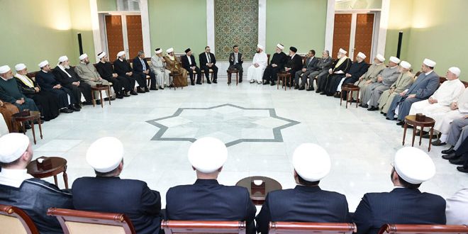 Le président al-Assad a insisté sur l’importance du rôle des oulémas et des religieux dans le rehaussement du niveau de la maturité en vue de protéger la religion islamique et la société des risques qui les menacent, tels que l’extrémisme.