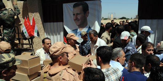Banlieue de Damas/Une nouvelle livraison d’aides humanitaires fournies par la Russie a été distribuée aujourd’hui aux citoyens déplacés en raison du terrorisme, dans le village de Najha al-Balad, avec la coopération du gouvernorat de la banlieue de Damas.