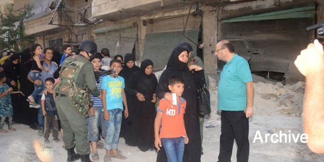 Alep/ Des dizaines de familles sont sorties aujourd’hui des quartiers est de la ville d’Alep, tandis que de nombreux hommes armés se sont rendus avec leurs armes pour régulariser leur situation en vertu du décret d’amnistie générale N°15 de l’année 2016.