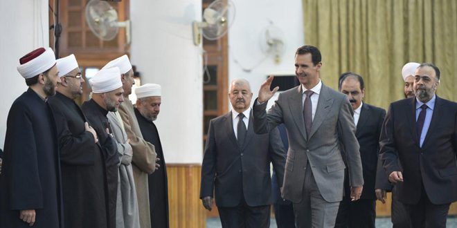 Damas /Le président Bachar al-Assad a pris part à une cérémonie religieuse, organisée aujourd’hui par le ministère des Waqfs dans la mosquée d’Ibad al-Rahmane dans la zone de Kafarsoussa à Damas, pour célébrer l’anniversaire du prophète Mohammad.