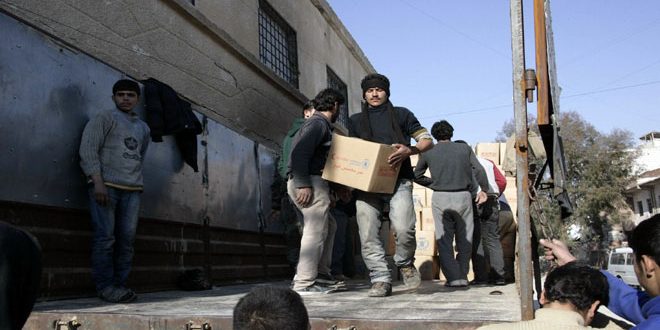 Banlieue de Damas / Un convoi d’aides humanitaires et de secours est arrivé aujourd’hui à la ville de Mouadhamiya pour les distribuer aux habitants sinistrés en raison du terrorisme.