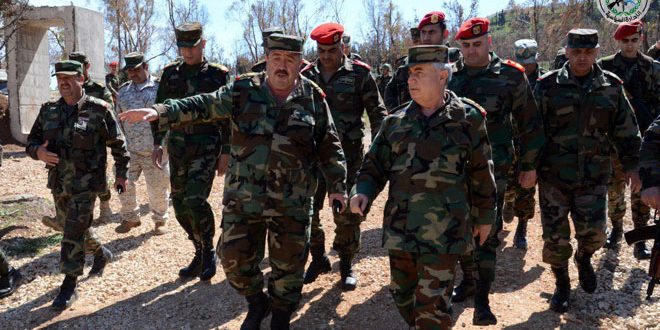 Hama/Sur directives du président Bachar al-Assad, Commandant en chef de l’armée et des Forces armées, le général Ali Abdallah Ayoub, chef d’état-major de l’armée et des Forces armées, a inspecté des positions et des points militaires dans la banlieue nord de Hama.