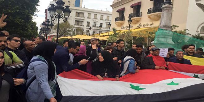 Les participants au sit-in, qui a été observé devant le théâtre municipal à la capitale Tunis, ont hissé les drapeaux syriens et tunisiens, et affirmé leur appui à la Syrie face à la guerre terroriste qui la vise.