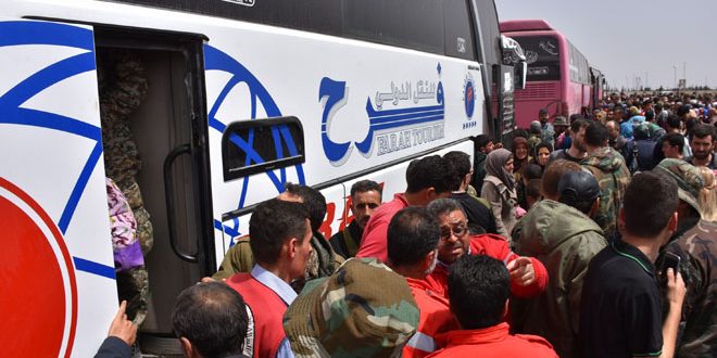 Le correspondant de SANA à Alep a fait savoir que 45 autobus transportant à bord 3,000 personnes des habitants des deux localités de Kefraya et Fouaa étaient arrivés au centre d’accueil temporaire à Jebrine à l’est de la ville d’Alep et que 18 autres autobus avaient transporté 500 hommes armés de Zabadani et un certain nombre de leurs familles à la banlieue sud d’Alep et ensuite à Idleb.