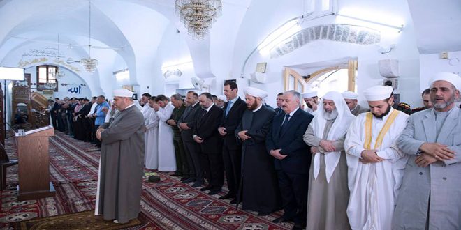 Le ministre des Waqfs, Mohammad Abdel Sattar al-Sayyed, le mufti de la République, Ahmad Badreddine Hassoun, le gouverneur de Hama, le secrétaire du Parti Baas arabe socialiste branche de Hama, des membres de l’Assemblée du peuple et une foule d’Ulémas et de citoyens ont fait la prière avec le président al-Assad.
