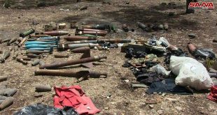 Homs/ Lors du ratissage du village de Ghanto dans la banlieue nord de Homs, les services compétents ont découvert des armes diverses, des roquettes, des obus de mortier et de mines …