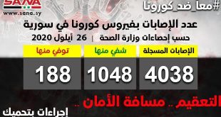 דמשק – סאנא משרד הבריאות ברפובליקה הערבית הסורית דיווח כי 37 בני אדם חדשים נדבקו בווירוס הקורונה, בנוסף ל- 20 אשר החלימו ו- 3 חולים מתו. משרד הבריאות ציין כי …