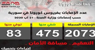 דמשק – סאנא משרד הבריאות הודיע כי 65 בני אדם אובחנו בנגיף קורונה ו- 15 החלימו ומקרה אחד נפטר. משרד הבריאות ציין כי מניין המקרים הנשיאים לקורונו עמד על 2073 …