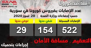 דמשק – סאנא משרד הבריאות עדכן היום כי 26 מקרי הידבקות חדשים בווירוס הקורונה נרשמו לאנשים שהיו במגע עם חולים בקורונה, ו- 10 מקרי החלמה, ו- 4 אנשים חולים נפטרו …