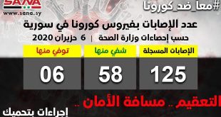 דמשק-סאנא משרד הבריאות הודיע על תחלואתם של חמישה מקרים של הידבקות בנגיף קורונה ועל הידבקות מקרה חדש בנגיף קורונה לאדם העובד כנהג בקו סוריה-ירדן. משרד הבריאות הודיע כי סך …