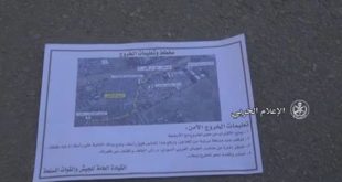 דמשק – סאנא מקור צבאי מסר לסוכנות סאנא כי מסוקים צבאיים השליכו היום מעל לכפרים ולעיירות במזרח גוטה, פרוסות של ניר כדי להודיע לאזרחים על דרכי היציאה מאזורי היערכות ארגוני …