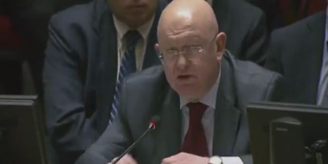 נציג רוסיה הקבוע ליד או”ם ואסילי ניבינזיה אמר היום במהלך ישיבת מועה”ב כי ישנם במזרח גוטה אלפי טרוריסטים ובמיוחד אלה של א-נוסרה שיורים יום יומית עשרות פגזים רקטיים לעבר דמשק מבלי שאף צד יביע גינוי או הוקעה, בדיוק כפי שלא גונתה השמדת העיר אל-רקה במלואה על ידי הקואליציה הבינ”ל בראשותה של ארה”ב.