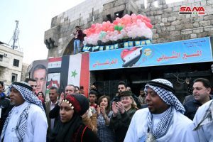 וצעירות שבאו מסניפי התאחדות הנוער בדמשק ובאל-קוניטרה, פרצה היום תהלוכה המונית נרחבת מכיכר אל-עבאסיין בואך עד באב תומא כאות ששון ושימחה כלפי ניצחונות הצבא הערבי הסורי מול הטרוריסטים וחזרת הביטחון לכל רחבי המולדת הסורית.
