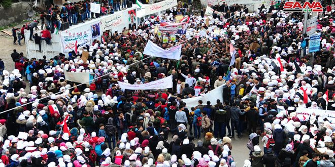עצרת מחאה של תושבי מזרח גוטה נגד הצהרת טראמפ בקשר לגולן הסורי הכבוש