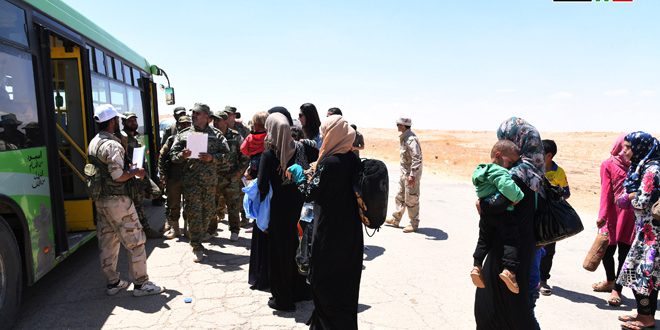 קבוצה חדשה של משפחות עקורות ששהו במחנה אל-רוכבאן שבאזור א-תנף, שבו פרוסים כוחות הכיבוש האמריקאי וקבוצות טרוריסטיות הנתמכות על ידיהם, חזרה היום למולדת דרך מעבר ג’ליגם בפרבר חומס המזרחי.
