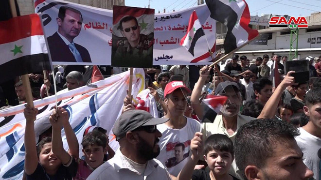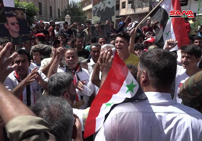 המשתתפים בעצרת נשאו דגלי הלאום ושלטים בגנות מעשיהם של כוחות התוקפנות נגד העם הסורי, והדגישו את התיציבותם מסביב לצבא הערבי הסורי והצמרת בעימות עם המצור המעוול.