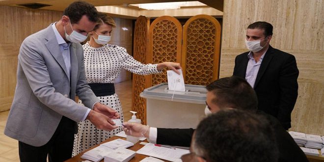 הנשיא מר בשאר אלאסד ורעיתו הגברת אסמאא אלאסד הצביעו לבחירת חברי מועצת העם 2020-07-19
