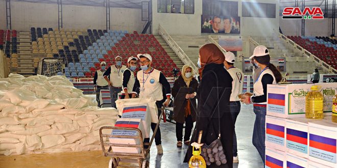 מועצת העסקים הרוסית-סורית בשותפות עם האגודה הרוסית לפיתוח קשרי ידידות עם סוריה, חילקה היום סלי מזון לכאלף משפחות שנפגעו מהטרור במחוז דמשק באולם הספורט של תשרין.