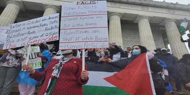 בוואשינגטון בירת ארה”ב התקיימה הפגנה רבת משתתפים לאות תמיכה בעם הפלסטיני שכללה בני הקהילות הפלסטיניות והערביות ואוהדים אמריקנים.