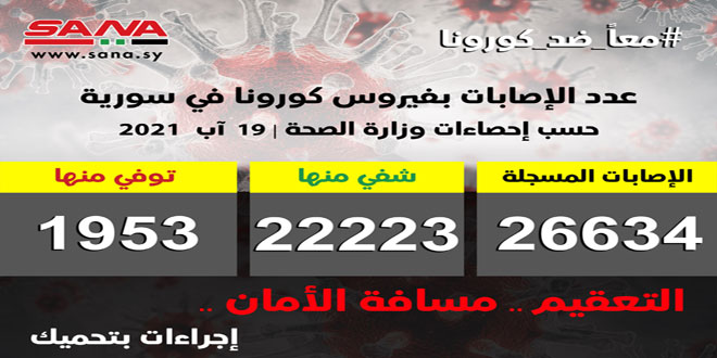 משרד הבריאות דיווח כי מספר המאומתים בסוריה עלה ל– 26634 בני אדם, מהם החלימו כ– 22223 ו– 1953 מתו.
