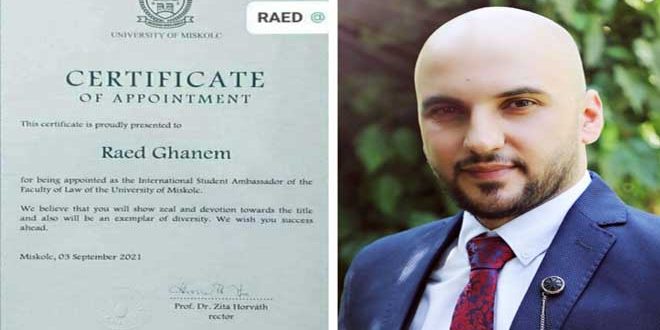 במהלך טקס רשמי שאליו הצטרפו אנשי מדע, סופרים ומרצים אשר באו ממדינות אירופה, קיבל הצעיר הסורי ראאד ע’אנם את תואר השגריר של הסטודנטים הבינ”ל מאוניברסיטת מיסקולק שבהונגריה.