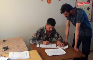 כתב סאנא בדרעא דיווח כי עשרות חמושים, מבוקשים ונמלטים מהשרות הצבאי מכפרי אגן הירמוך הצטרפו לפעולת ישוב מצבם ומסירת כלי הנשק לידי הצבא הערבי הסורי במרכז ההסדרה שנפתח אתמול בכפר אלשג’רה בריף המחוז על ידי הגופים המעוניינים בדבר.