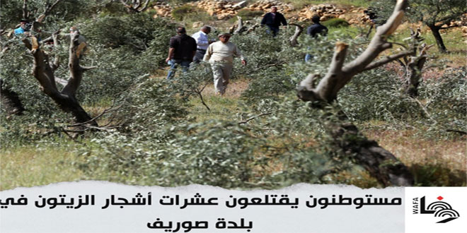 סוכנות ו’פא דיווחה כי מתנחלים פשטו על העיירות בית אומר וסוריף בצפון חברון, ותקפו את החקלאים ועקרו 50 עצי זית באזור דהר אל-מנסרה, מזרחית לסוריף, כדי להשתלט על אדמות הפלסטינים לטובת התנחלות שהוקמה באזור.