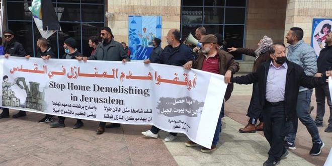 עשרות פלסטינים בעיר אל-קודס הכבושה השתתפו היום בעצרת מחאה על הריסת בתי הפלסטינים ע”י כוחות הכיבוש הישראלי כדי להרחיב פעולות ההתנחלות וליישם תוכניות הייהוד.