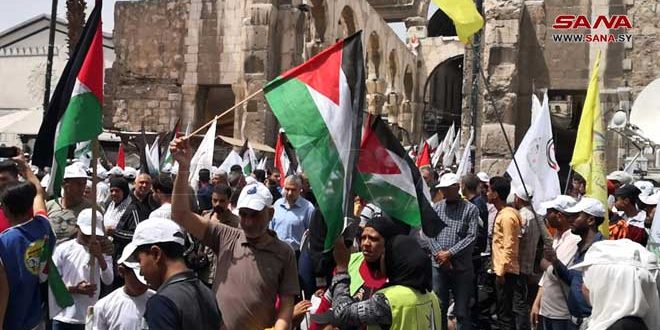 המשתתפים בתהלוכה שאורגנה על ידי הוועדה הקבועה של החייאת יום אל-קודס העולמי, הרימו מודל של מסגד אל-אקצא המבורך והדגלים של פלסטינה ושל ההתקוממות ושיננו סיסמאות המדגישות כי הזכויות הלגיטימיות של העם הפלסטיני יחזרו לבעליהן וכי הניצחון מול האוייב הציוני נחלתם של בני העם הפלסטיני.