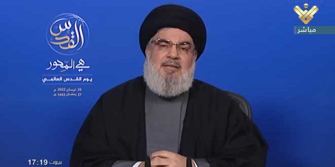 מזכ”ל חזב אללה מר חסן נסר אללה נשא היום נאום לרגל יום אל-קודס העולמי בו הדגיש כי ההימורים על שכיחת פלסטין הכבושה ואתריה הקדושים כבר הלכו וקרסו כי פלסטין מושרשת עמוק במצפון ובלב כל ערבי מוסלמי בן חורין.