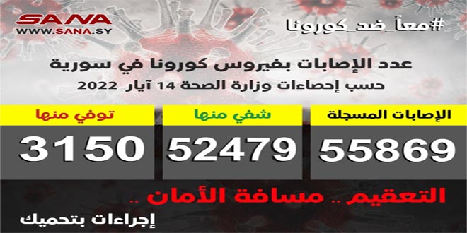 משרד הבריאות סיכם כי מספרם של המאומתים בסוריה עמד על 55869 מקרים מהם 52479 החלימו ו- 3150 הלכו לעולמם.