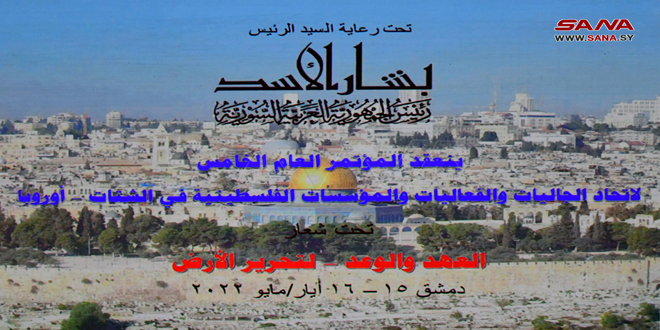 15/05/2022 דמשק-סאנא בחסות הנשיא בשאר אל-אסד החלה היום עבודתה של הוועידה הכללית החמישית של התאחדות הקהילות, הפעילויות והמוסדות הפלסטיניים בתפוצה- אירופה. הכנס יתקיים בסיסמה (ברית והבטחה.. לשחרור האדמה) בדאר אל-אסד לתרבות ואמנויות בדמשק. תחילת עבודתה של הוועידה הכללית החמישית של איגוד הקהילות האירועים והמוסדות הפלסטיניים בתפוצה 2022-05-15 sammar