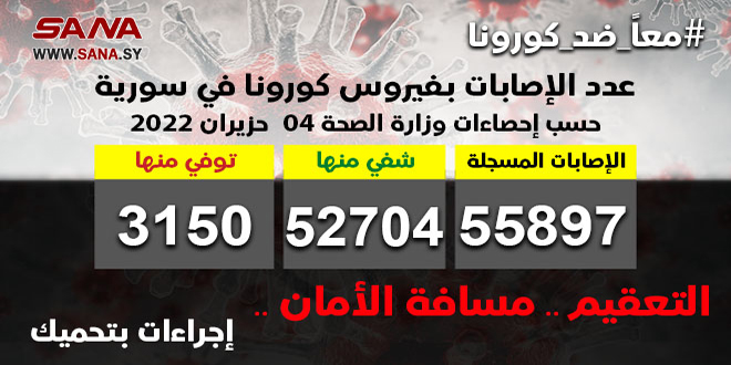 דמשק – סאנא משרד הבריאות דיווח כי מקרה אחד אובחן כמאומת בקורונה בנוסף ל- 3 שהחלימו. משרד הבריאות סיכם כי מספרם של המאומתים בסוריה עמד על 55897 מקרים מהם 52704 החלימו ו- 3150 הלכו לעולמם.