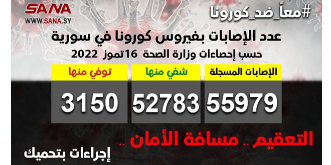 משרד הבריאות סיכם כי מספרם של המאומתים בסוריה עמד על 55979 מקרים, מהם 52783 החלים, ו- 3150 הלכו לעולמם.
