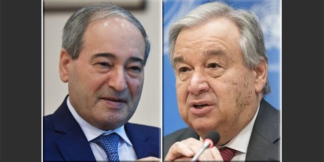שר החוץ והמהגרים ד”ר פיסל אלמוקדאד דן היום עם מזכ”ל האו”ם אנטוניו גוטריס בשית טליפון בהתפתחויות באיזור, בנוסף לאופקי שתוף הפעולה בכל התחומים בין סוריה לאו”ם .